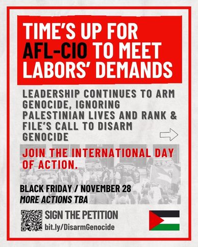 The AFL-CIO’s leadership continues to ignore labor’s moral call — refusing to cut ties with the arms industry and turning a blind eye to the ongoing genocide against Palestinians. Workers across the U.S. and around the world are demanding accountability: it’s time for the AFL-CIO to meet labor’s demands and stop arming oppression.